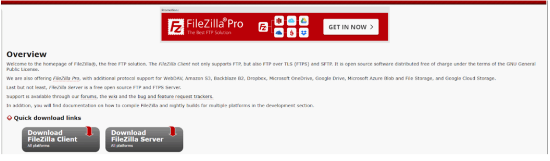 Para começar, acesse o site oficial do FileZilla e clique em Download FileZilla Client para baixar o software na sua máquina.