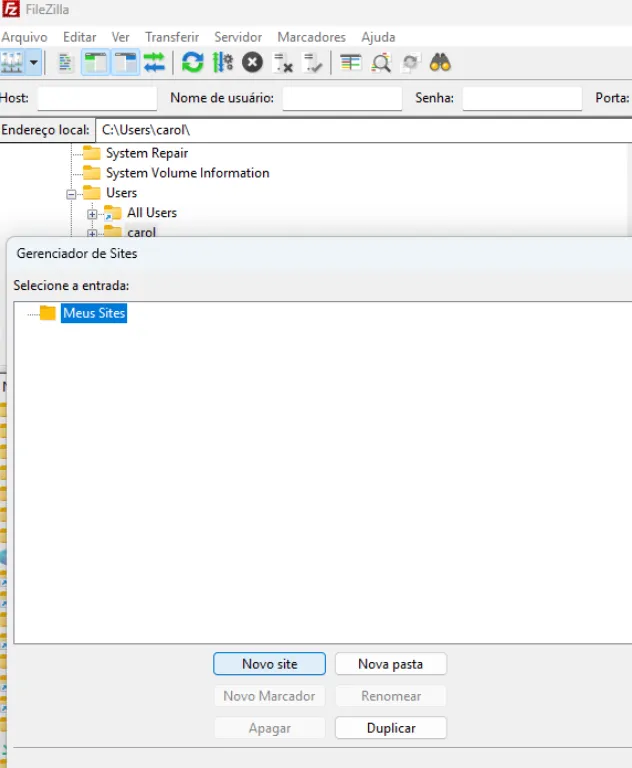 - Acessar o Gerenciador de Sites dentro do FileZilla;