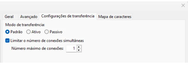 - Na aba Configurações de transferência, escolha o Modo de transferência (Padrão ou Passivo) e estabeleça o número máximo de conexões simultâneas;