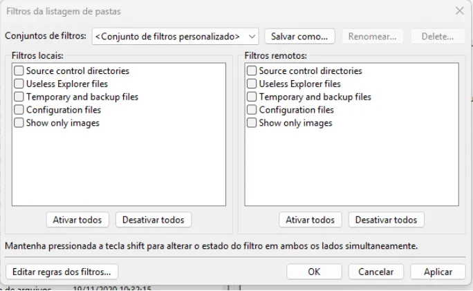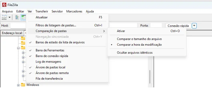 Uma função muito útil do FileZilla é a de comparação de diretórios. Quando ativada, ela usa diferentes cores para mostrar as diferenças entre os arquivos de cada painel: