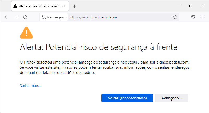 No Firefox, a mensagem costuma ser “Alerta: Potencial risco de segurança à frente” com códigos como SEC_ERROR_UNKNOWN_ISSUER.