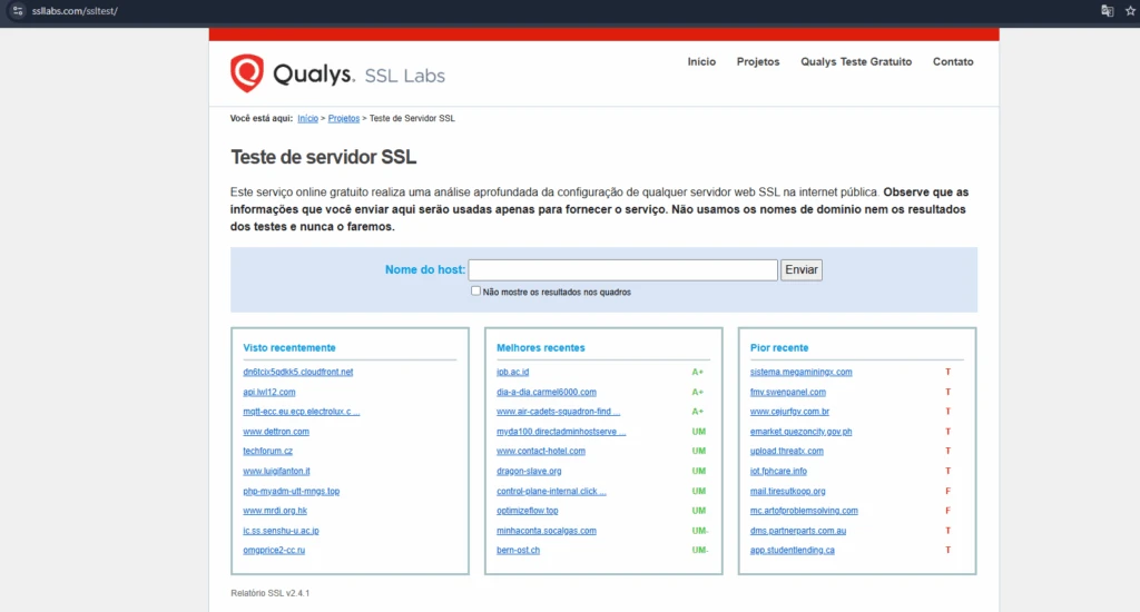 Use ferramentas como SSL Labs Qualys SSL Labs – SSL Server Test para avaliar o certificado, a cadeia de certificação e possíveis falhas. O relatório indica certificados intermediários ausentes, problemas de compatibilidade TLS e erros em CN/SAN, informações essenciais para direcionar a correção.