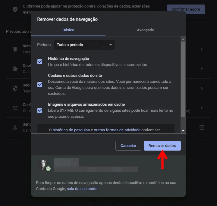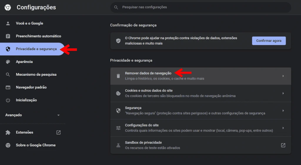 - No Chrome, vá em Configurações > Privacidade e Segurança > Remover dados de navegação.