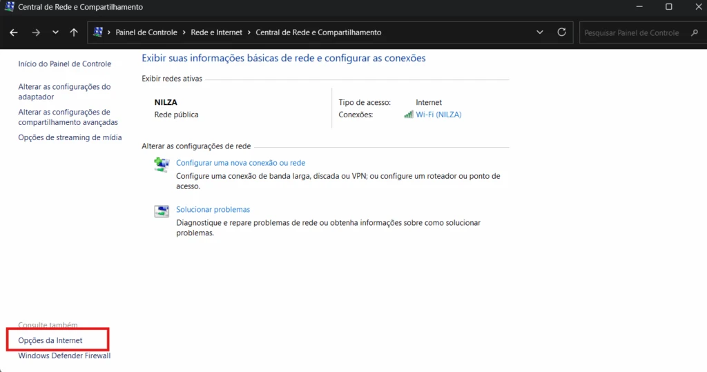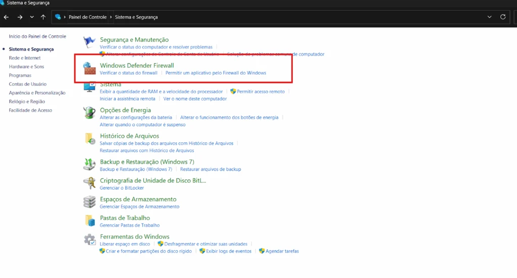 - Depois em Sistema e Segurança, selecionando o Firewall do Windows Defender;