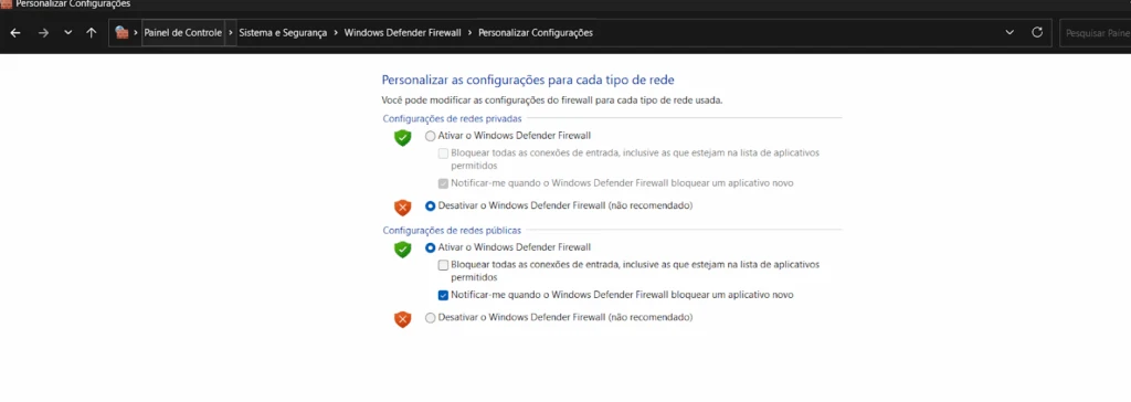 - Agora é só desativar o firewall do Windows.