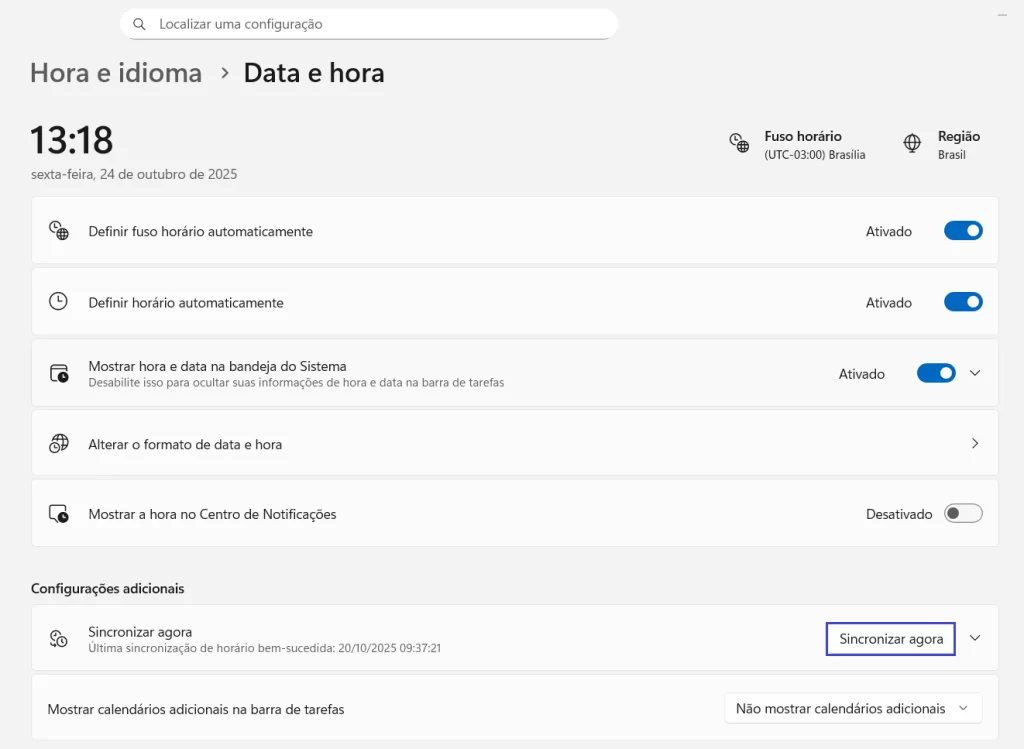 Também é recomendado clicar em “Sincronizar agora”, na mesma tela, pois isso força a atualização do horário diretamente com o servidor NTP (Network Time Protocol). Após o ajuste, reinicie o navegador e tente acessar o site novamente.