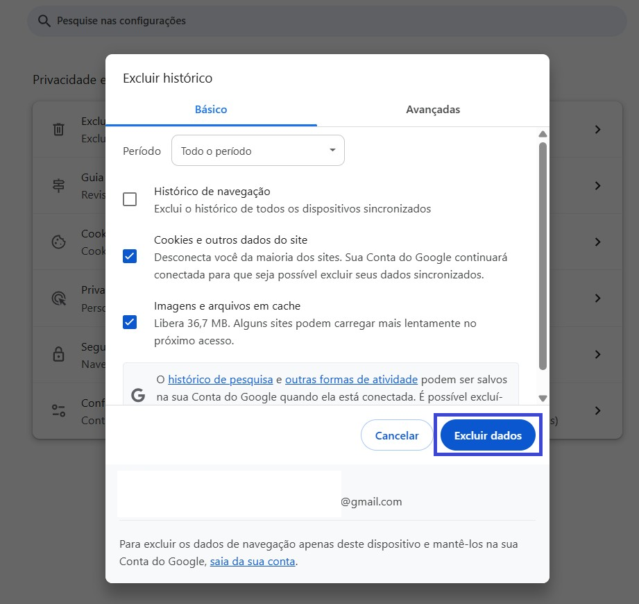 Faça isso tanto na aba “Básico” quanto “Avançadas”, lembrando de escolher um período — “Última hora”, “Últimas 24 horas” etc. Por fim, clique no botão “Excluir dados”, reinicie o Chrome e tente acessar o site que deseja.