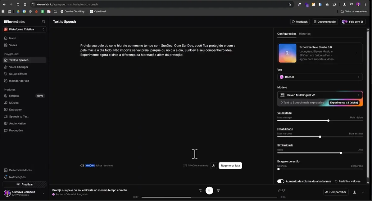A ElevenLabs é uma das plataformas de Text-to-Speech (texto para fala) mais avançadas do mercado. Ela transforma qualquer texto em uma locução natural e envolvente, ideal para vídeos publicitários, tutoriais e reels.