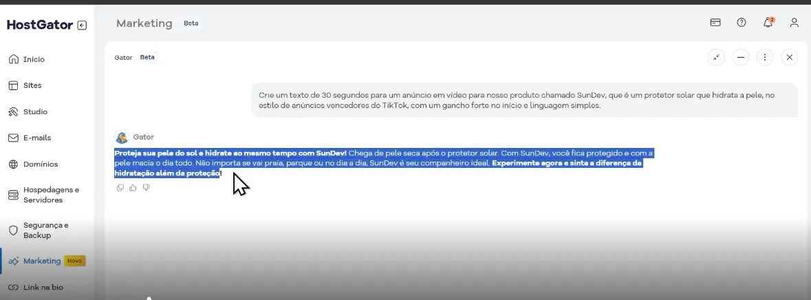 Você pode gerar seu roteiro diretamente com o Agente de Marketing da HostGator, que cria textos prontos para vídeos, anúncios e redes sociais. Basta pedir algo como: