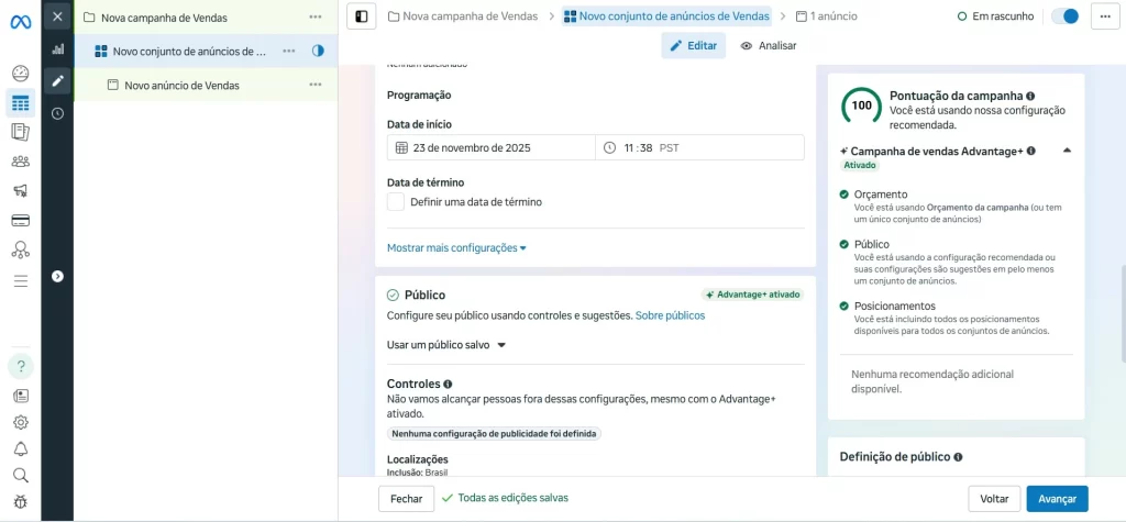 Uma dica sobre esse ponto é evitar alterações constantes nas campanhas ativas, pois o algoritmo precisa de tempo para aprender com os resultados e otimizar a entrega. O mais recomendado é deixar a campanha rodar por alguns dias antes de fazer ajustes.