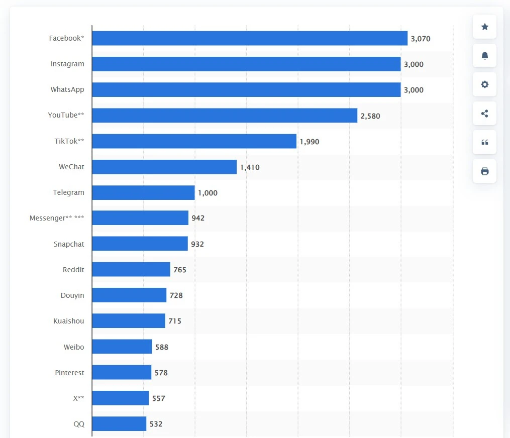 Para você ter uma ideia, segundo um levantamento de fevereiro de 2025 da Statista, só o Facebook, Instagram e WhatsApp tinham três bilhões de usuários ativos mensais cada. Veja no gráfico: