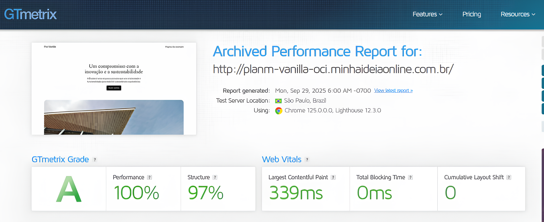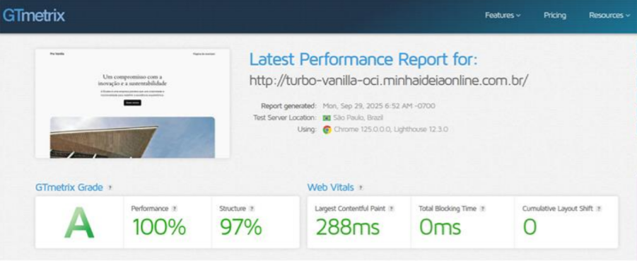 - Nota de até 100% em performance no GTmetrix: nos testes do GTmetrix, os sites HostGator atingiram nota máxima (100%) em performance e até 97% de eficiência estrutural, superando benchmarks de mercado e demonstrando a robustez da arquitetura OCI.
