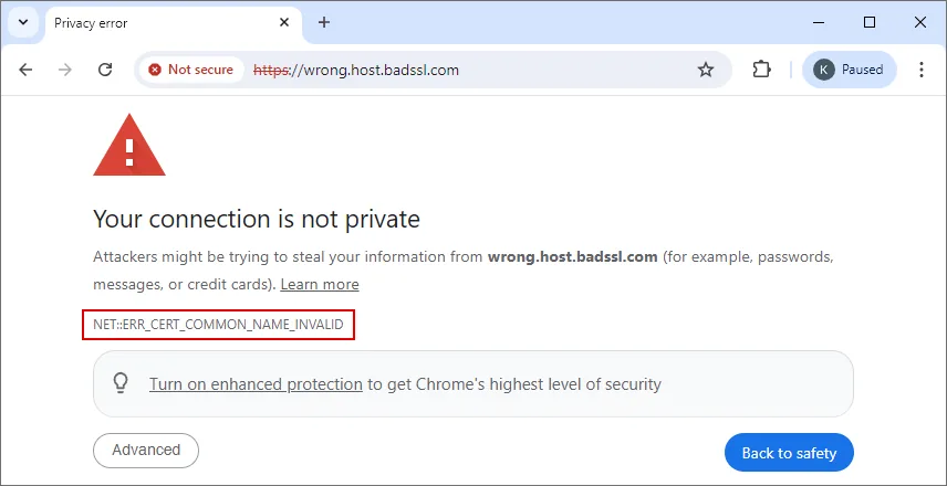 - Google Chrome: NET::ERR_CERT_COMMON_NAME_INVALID