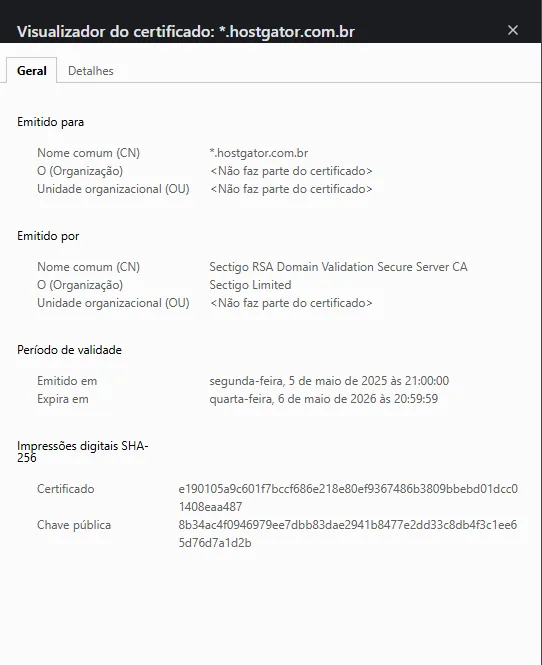 Aqui você consegue verificar as informações sobre o certificado do site.