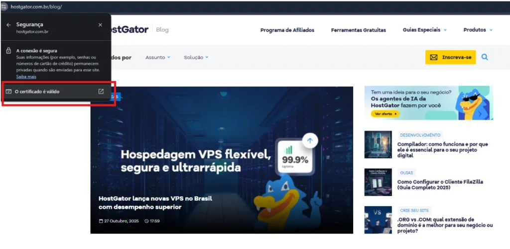 O primeiro passo é inspecionar o certificado diretamente no navegador. Para isso, basta clicar no ícone do cadeado ao lado da URL e selecionar a opção “Certificado”.