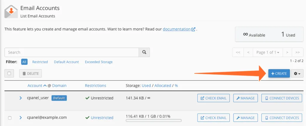 Na página seguinte, selecione um domínio, um nome de usuário e uma senha. Clique em Criar na parte inferior da página e o cPanel irá gerar uma nova conta.