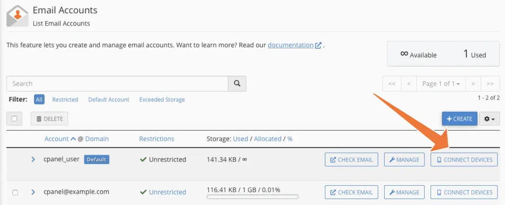 A próxima etapa é configurar o seu cliente para que ele saiba a qual servidor se conectar e como autenticar. As configurações SMTP do cPanel necessárias estão disponíveis na interface Conectar Dispositivos .
