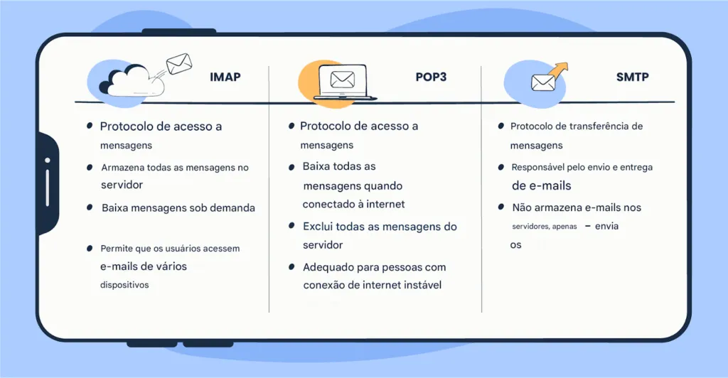 | IMAP | Recebimento | Sincroniza mensagens entre servidor e dispositivos, mantendo cópias nos dois | Quando acessa a mesma conta em vários dispositivos (ex.: Gmail no celular e no computador) |