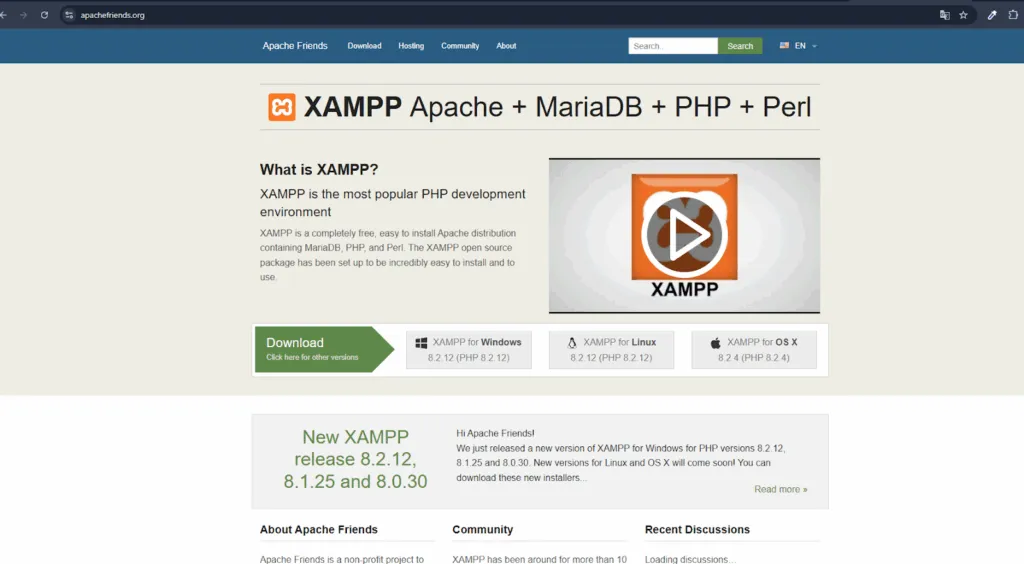 O próximo passo é acessar o site oficial do XAMPP XAMPP Apache + MariaDB + PHP + Perl e baixar a versão compatível com o seu sistema operacional (Windows, macOS ou Linux).