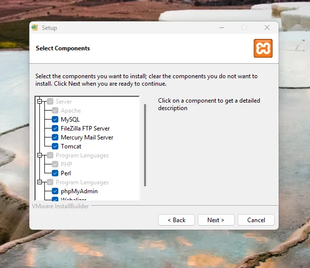 Durante a instalação, o assistente exibirá a lista de componentes disponíveis, como Apache, MySQL, FileZilla e phpMyAdmin. Você pode selecionar apenas os serviços que realmente pretende utilizar, o que torna o processo ainda mais flexível.