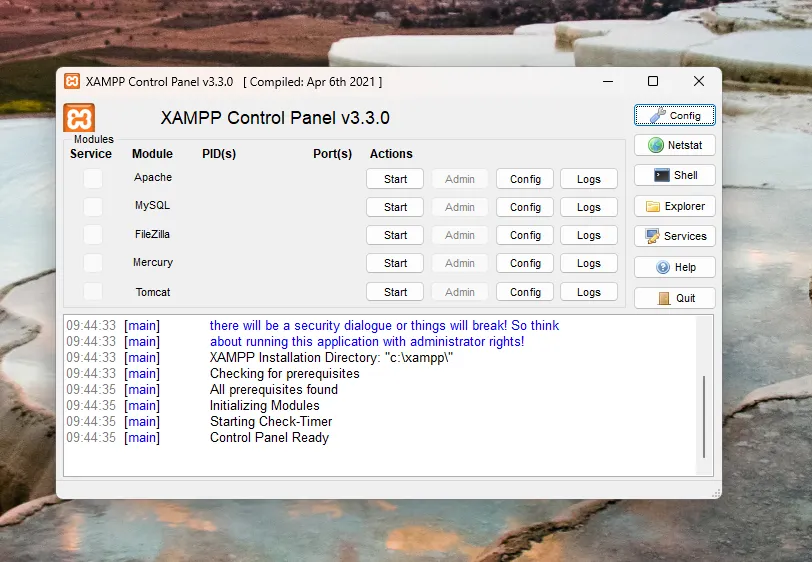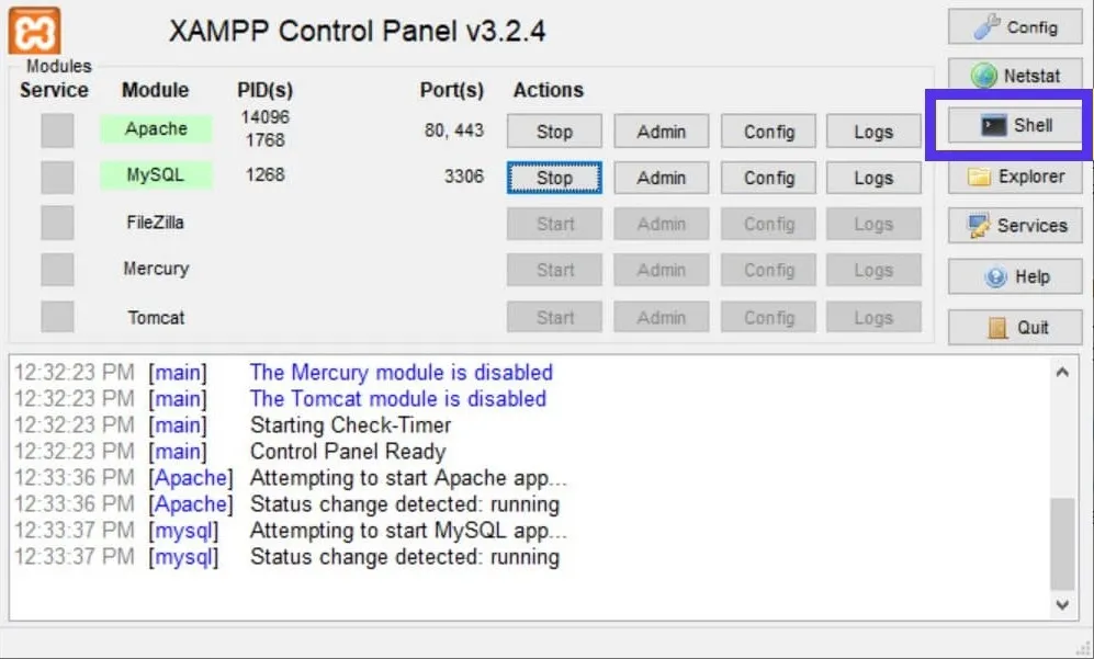 Para começar, abra o seu Painel de Controle XAMPP e clique no botão Shell no lado direito.