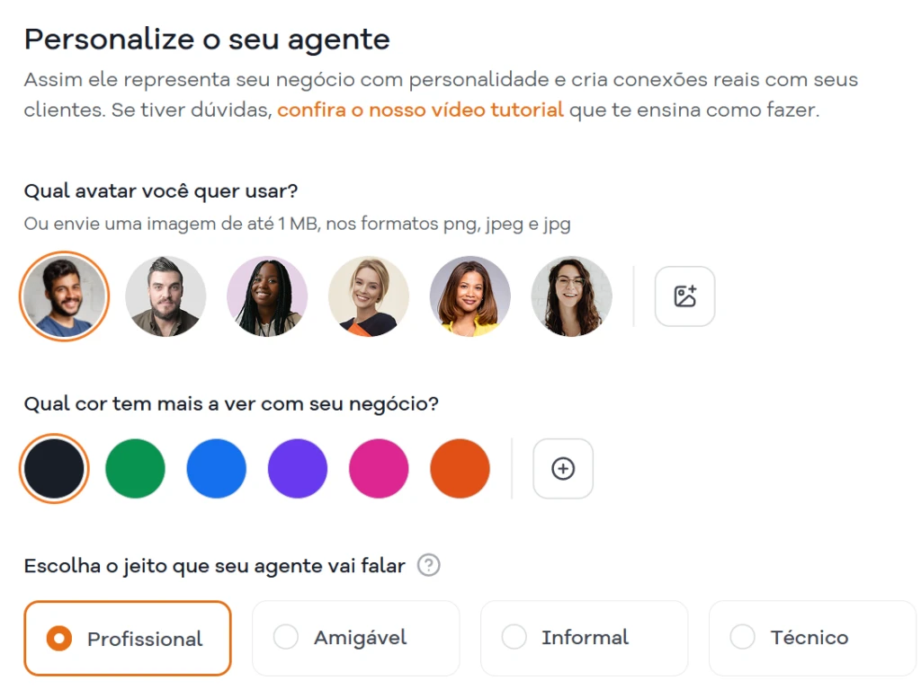 - Personalize o seu agente, escolhendo um avatar, cor que mais combina com o seu negócio e em qual tom ele ou ela vai falar (amigável, profissional, técnico ou informal);