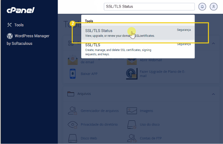 - Digite SSL/TLS status na barra de pesquisa e clique na opção encontrada;