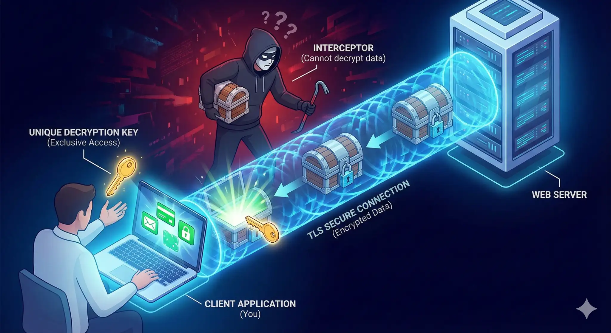Este protocolo funciona criptografando os dados que são transmitidos entre um servidor e um cliente. Para descriptografar as informações é necessário possuir uma chave única, que só o dispositivo do cliente terá acesso. Portanto, mesmo que esses dados sejam roubados, o interceptador não será capaz de decodificá-los.